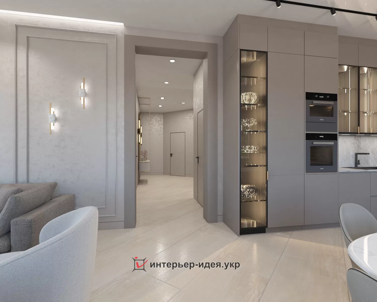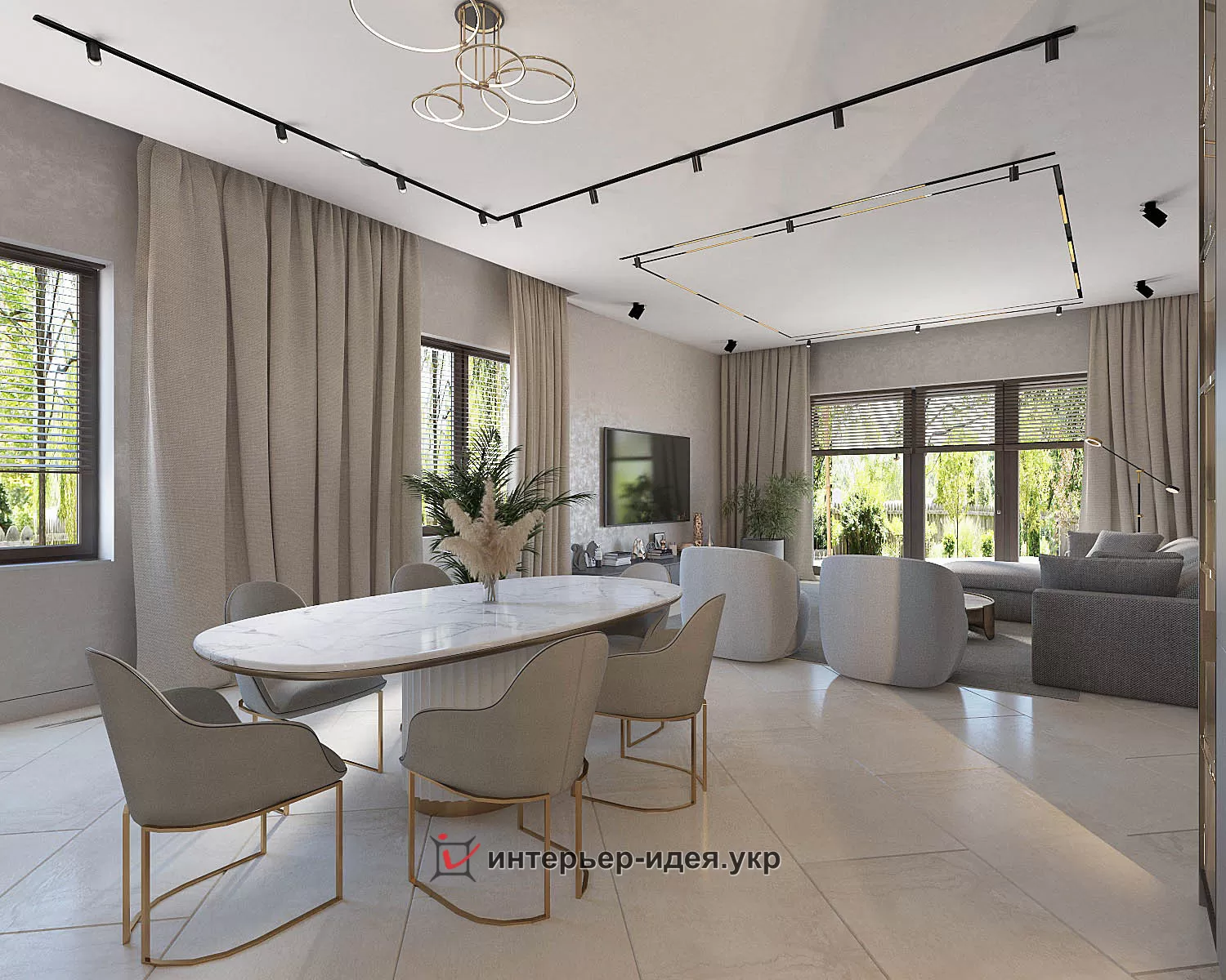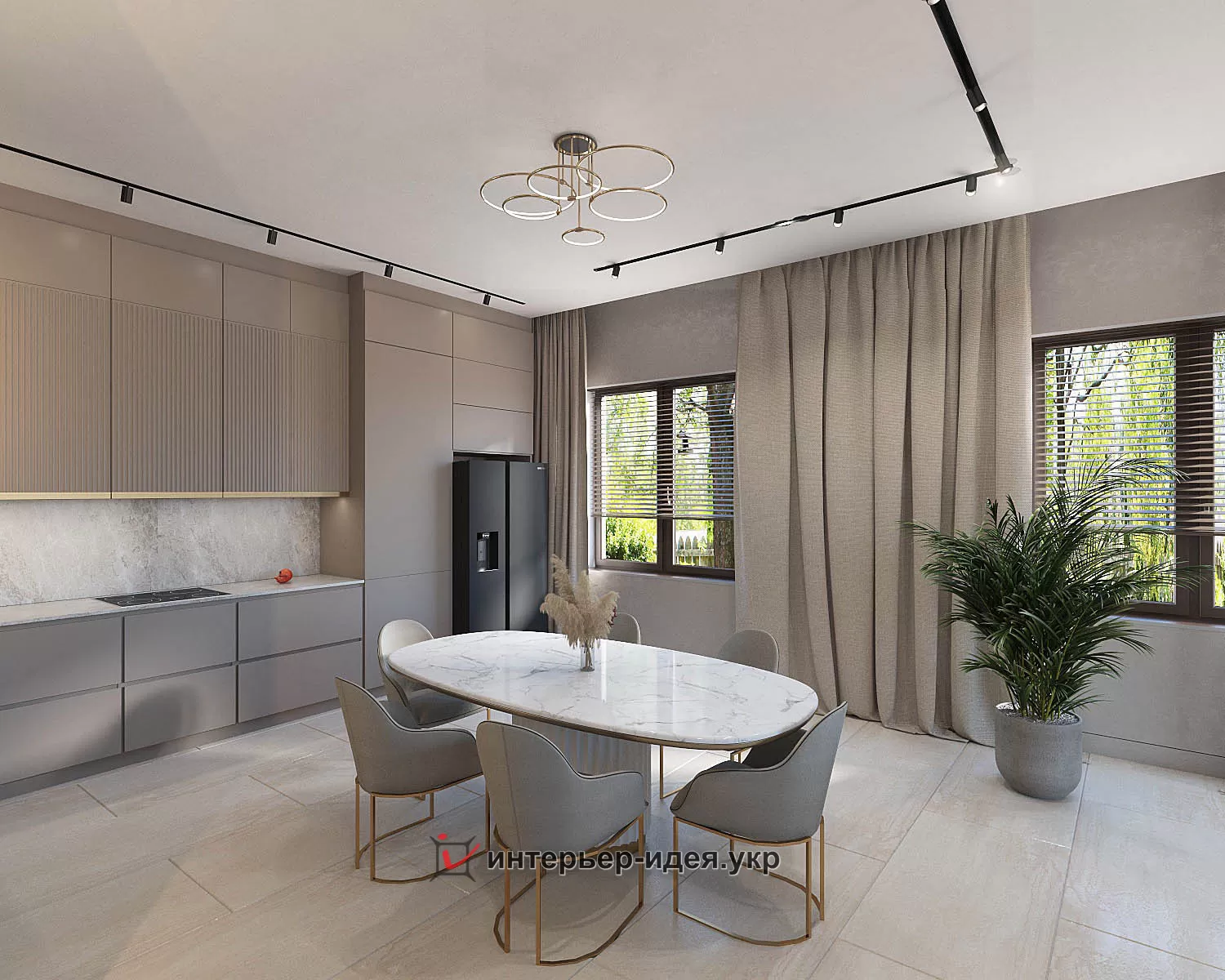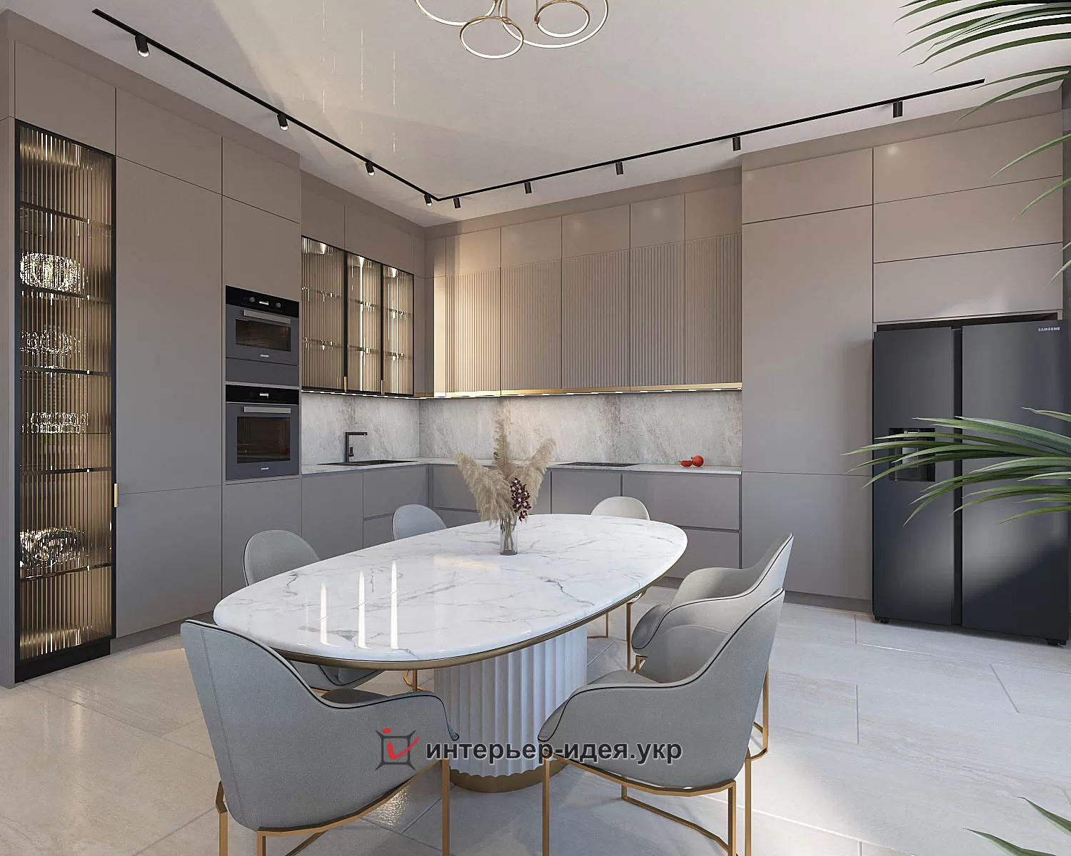 Основний тон всієї вітальні задала кухня, яка буде виконана з фарбованого МДФ, скляні фасади і вітрина для келихів з підсвічуванням роблять кухню досить ошатною та представницькою, що має місце в загальному просторі вітальні. Окрасою кухонної зони також виступає овальний обідній стіл з незвичайною формою стільцями.