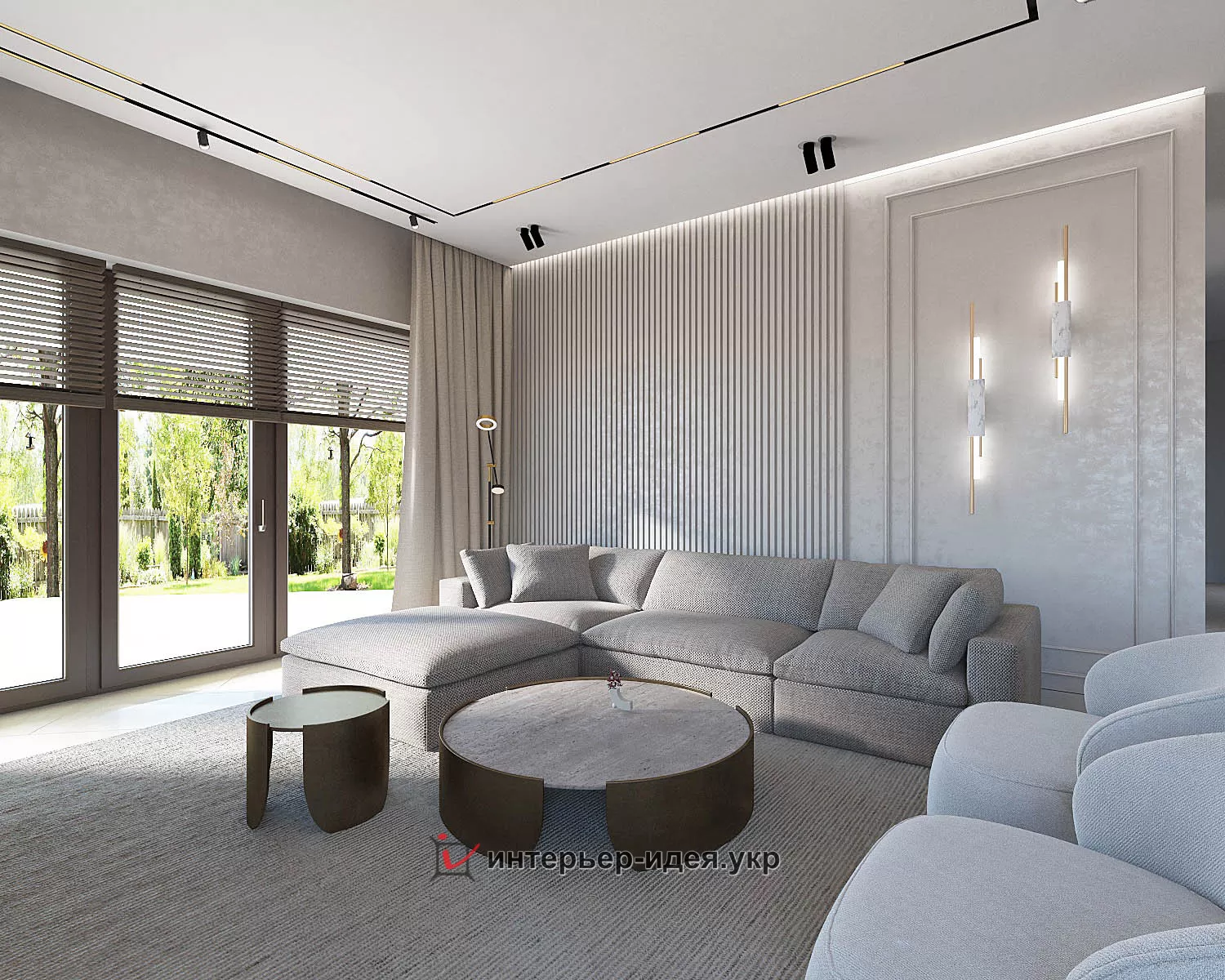 Основний декор в зоні дивана рейкова стінка з МДФ і декоративні молдинги по центру яких розташовані 2 декоративні бра.