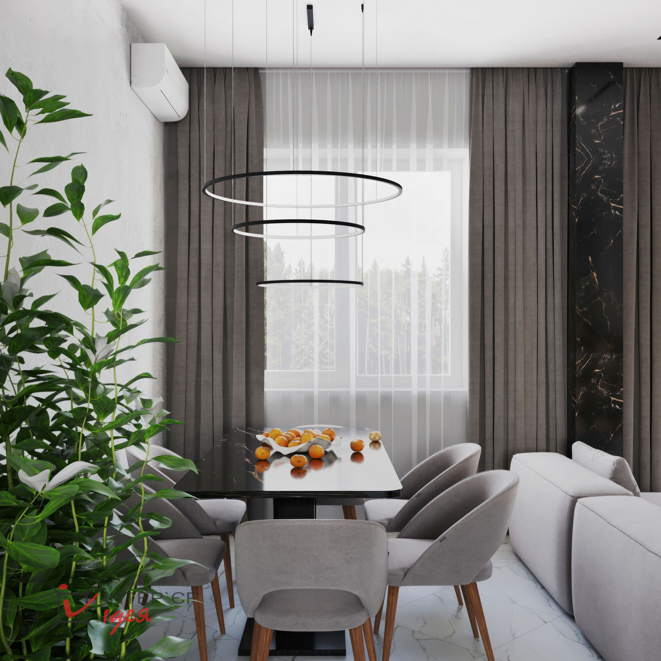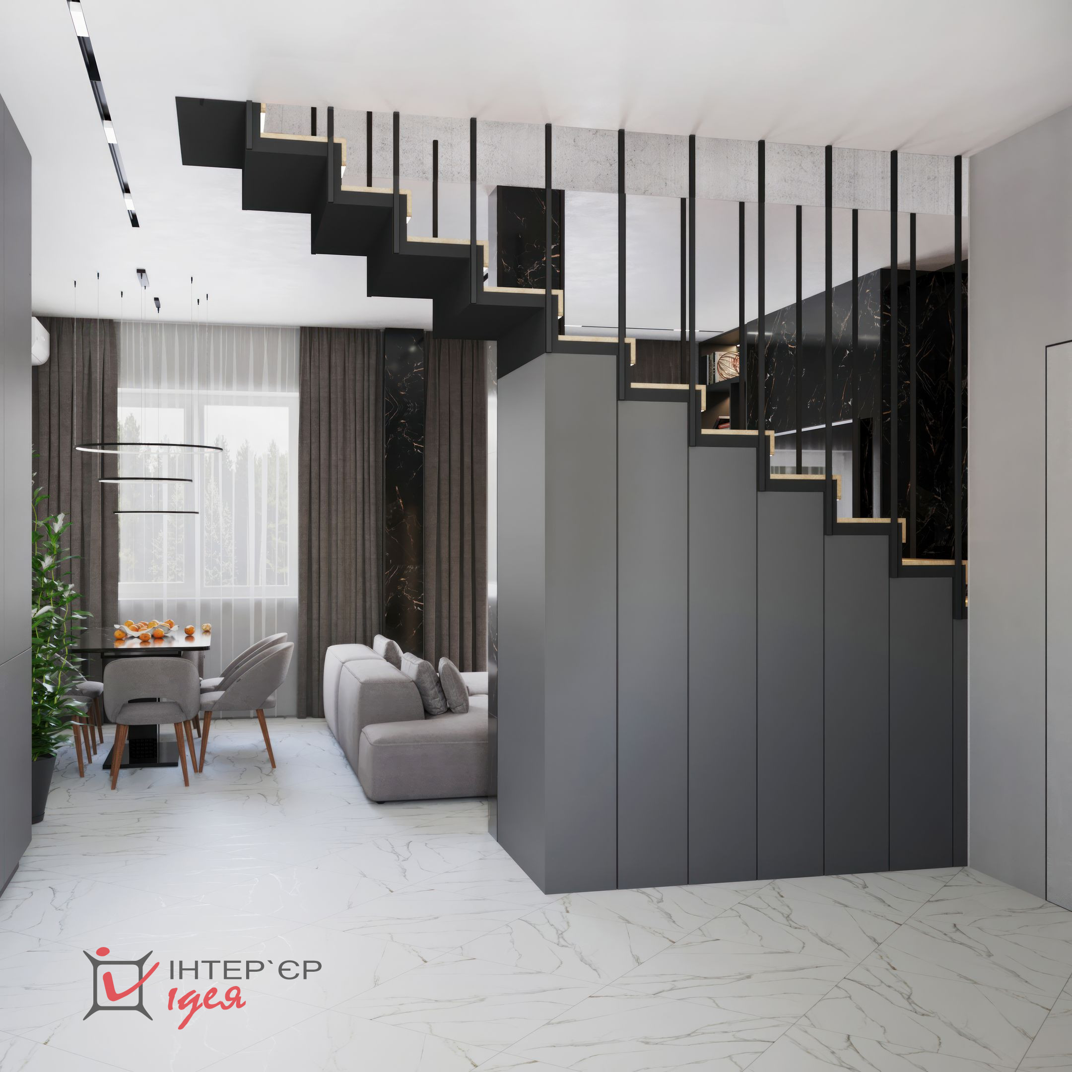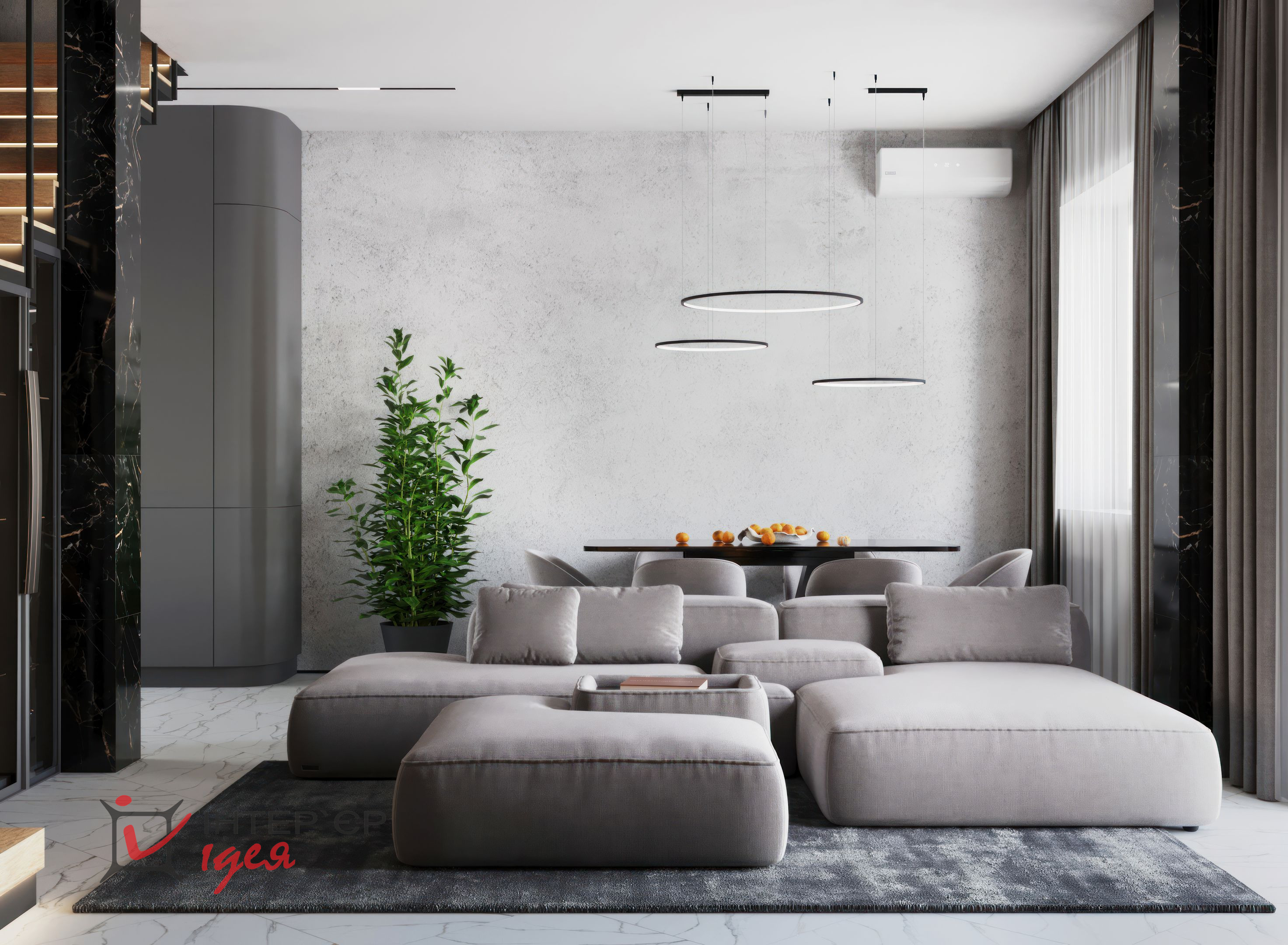 На стінах можна побачити декоративну штукатурку, що підкреслює сучасний стиль. Освітлення представлено трековою системою та витонченими підвісними світильниками з чорного металу, які створюють атмосферу затишку та стилю.