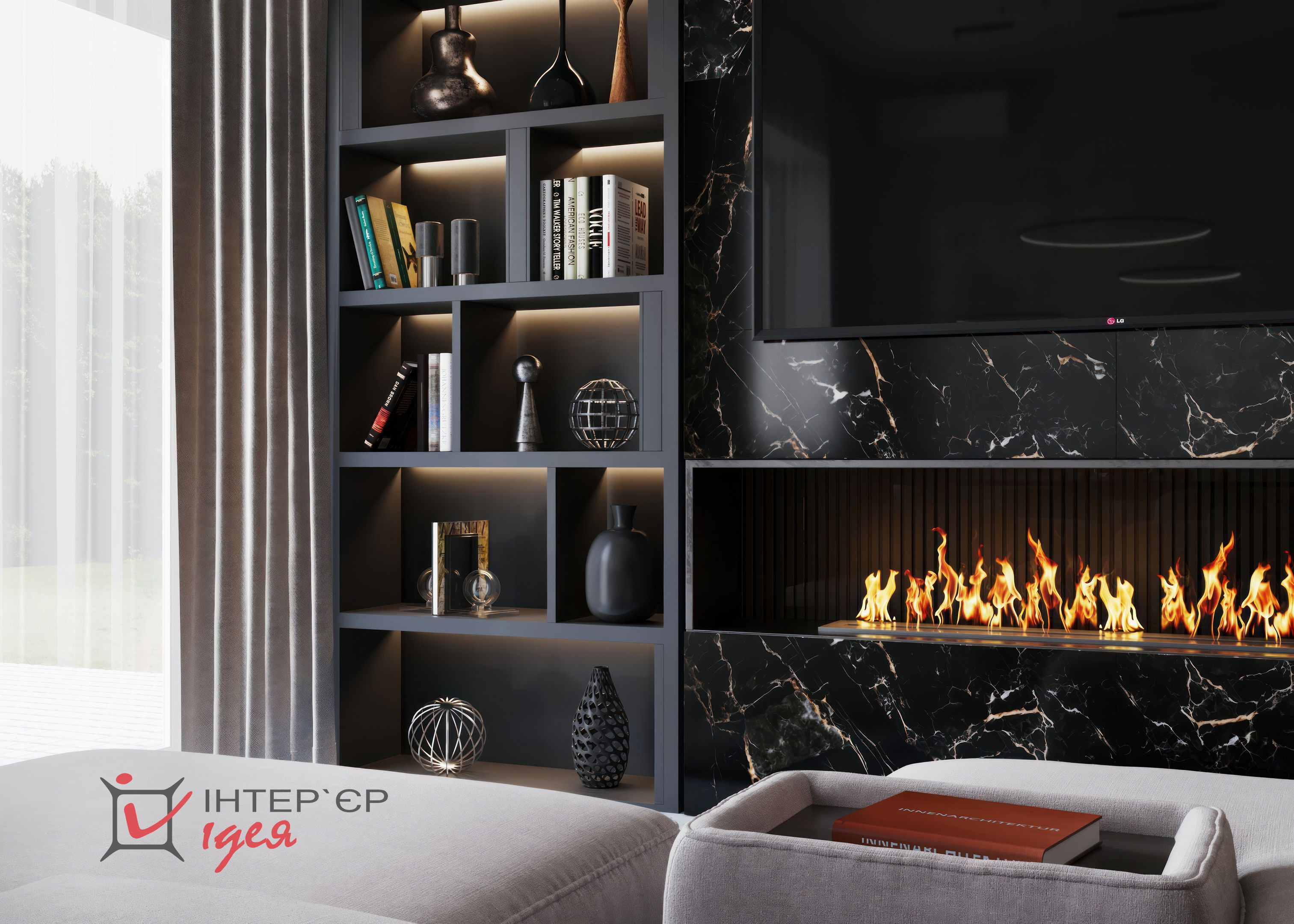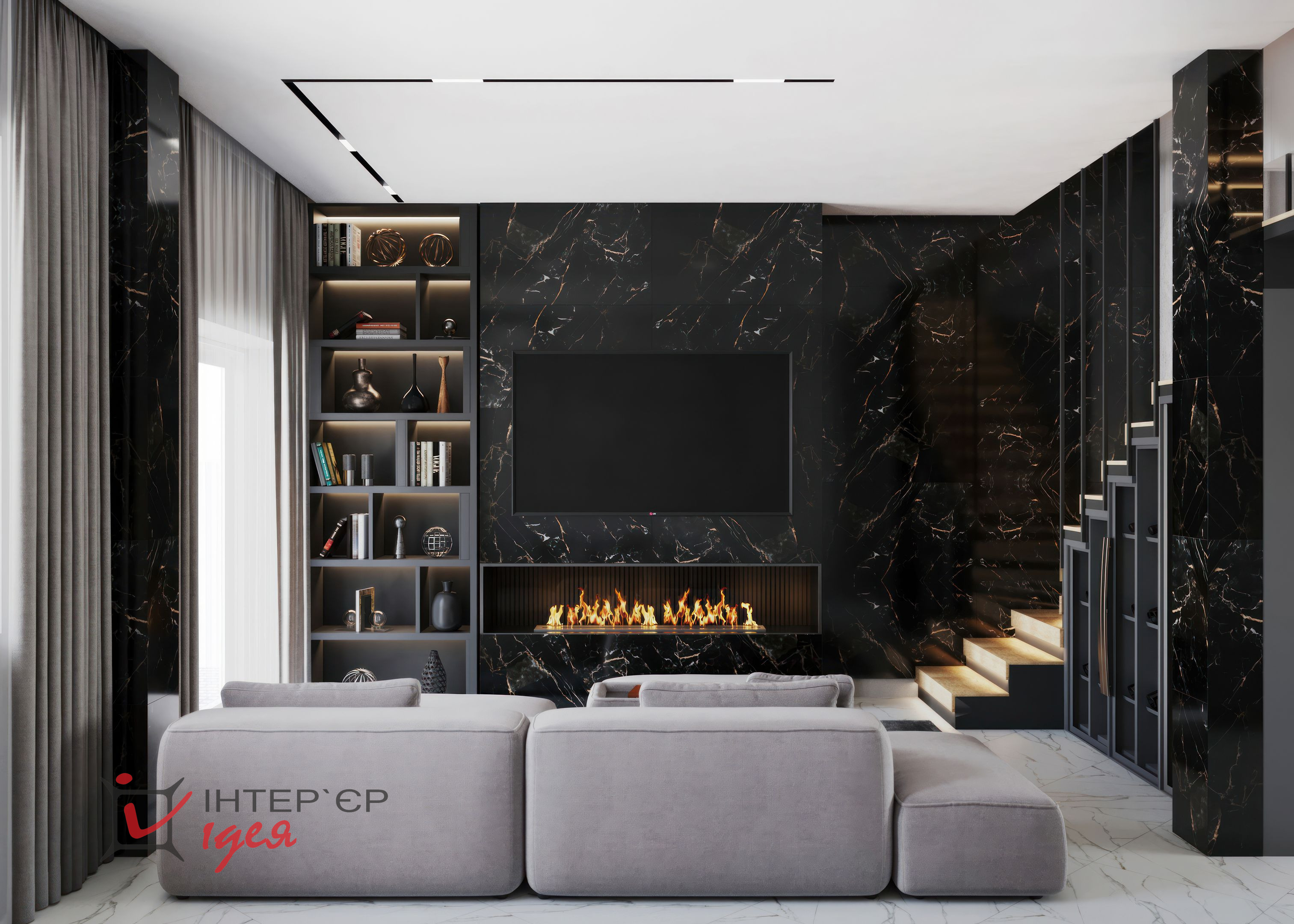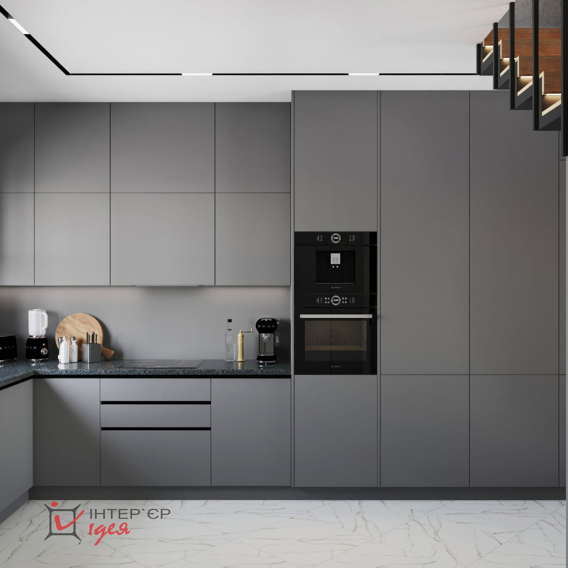 Кухонна зона представлена сучасними меблями з гладкими фасадами у сірому кольорі, що надає кімнаті легкості. Вбудовані шафи з чорними ручками додають контрасту та підкреслюють сучасний стиль. Стільниця з темного граніту виглядає розкішно і водночас практично.