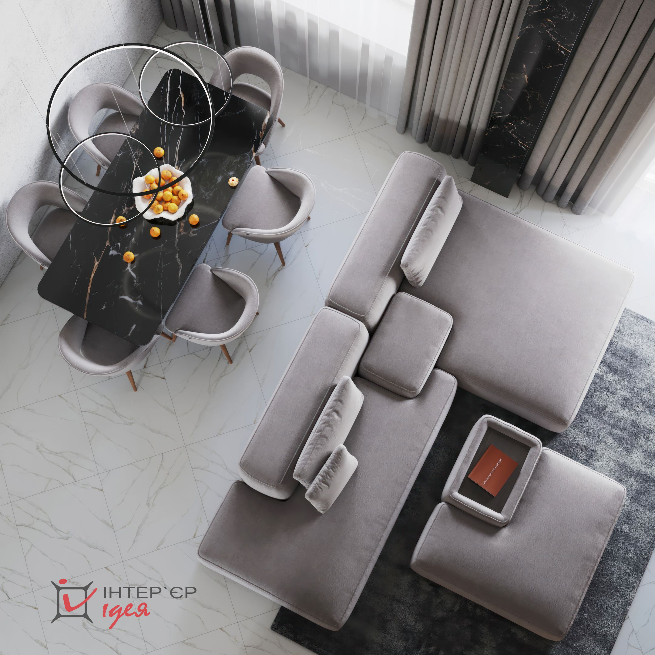 Вітальна зона плавно переходить у кухню, що забезпечує відкритий простір і зручність спілкування. Тут розташований великий диван у сірому кольорі з м’якими подушками, що запрошує до відпочинку. Перед диваном — стильний журнальний столик, який додає елегантності.